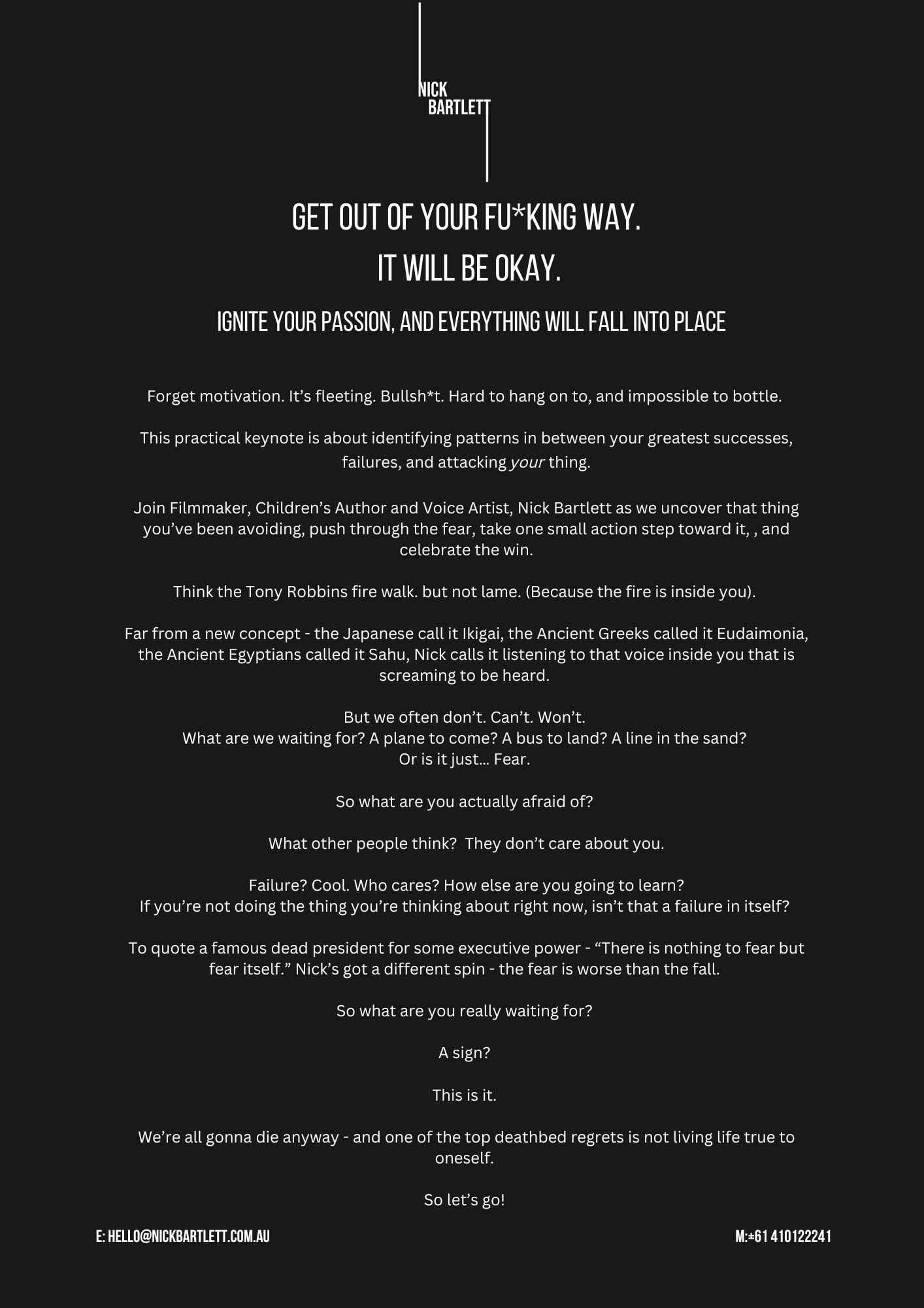 This practical 60-minute keynote is about uncovering your passion, taking on the fear and watch yourself grow. Have you ever wished you had taken that singing lesson, learnt to swim in the ocean, had a go at podcasting, or even reached out to that friend you fell out with. Now’s your opportunity to do just that. This keynote will enable all this and hold you accountable to follow through with your actions!